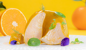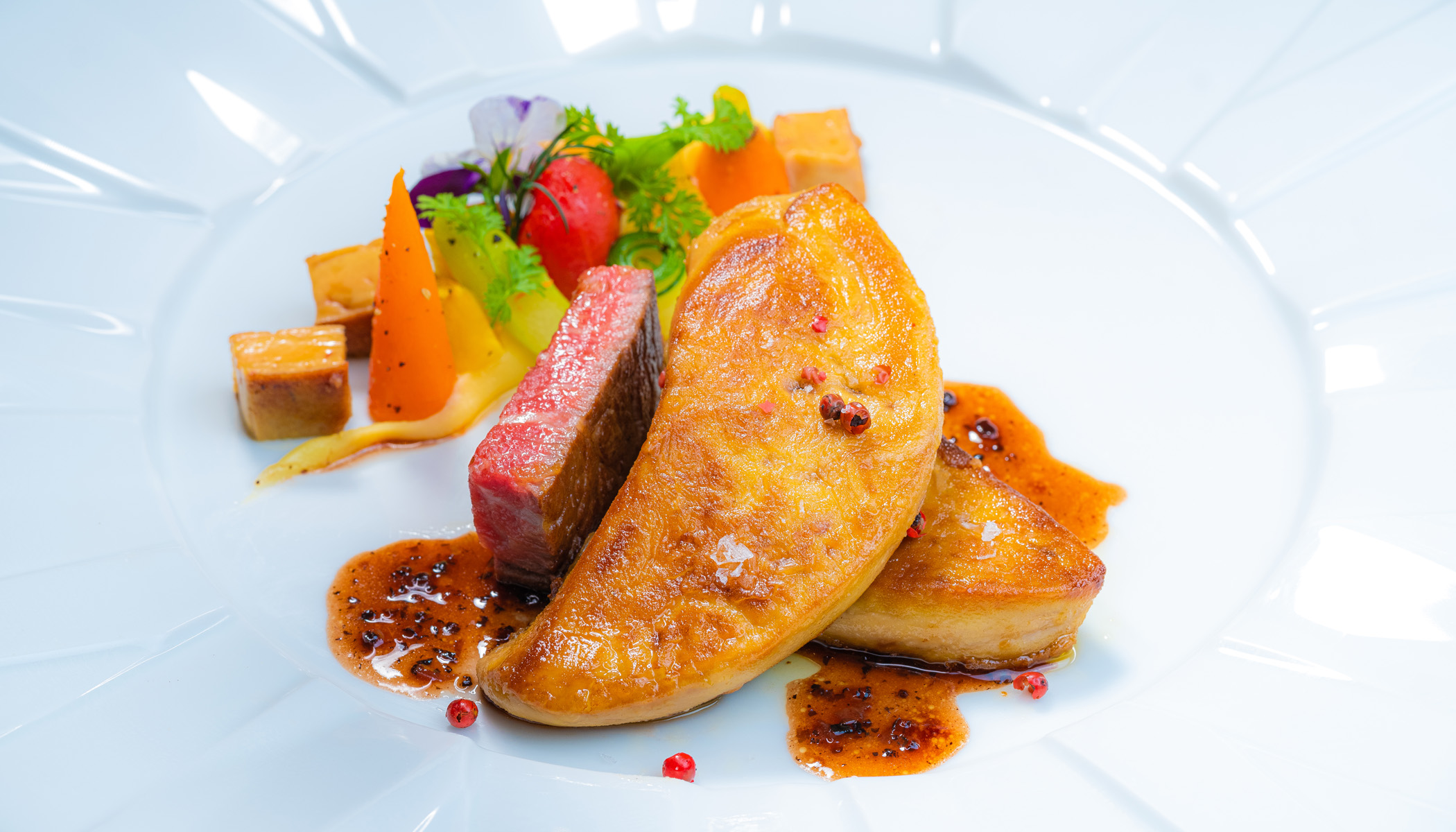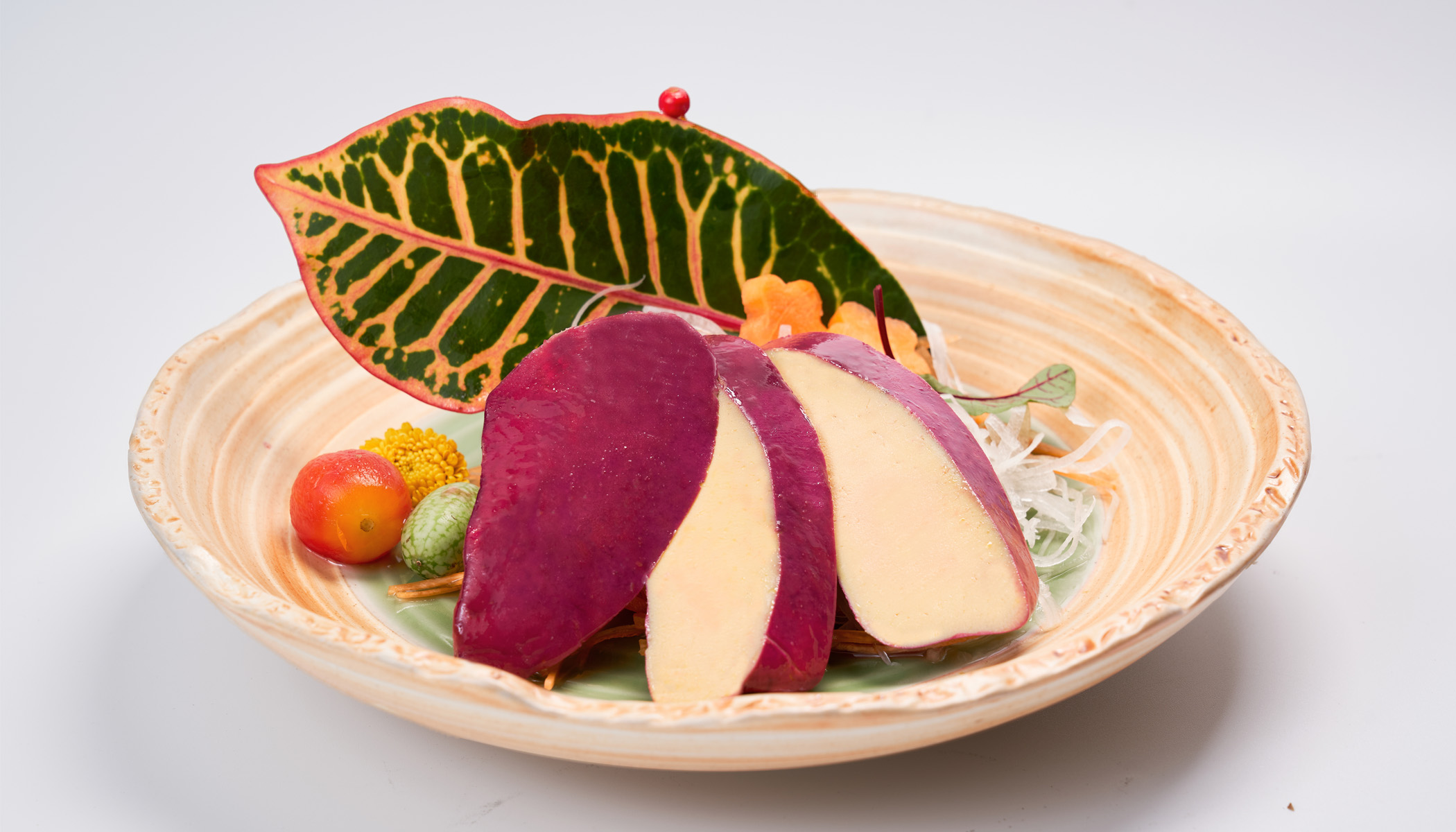 3、在鐵板340度加鍋蓋進(jìn)行燉制3分鐘,加入煎好的鵝肝至熟,即可。